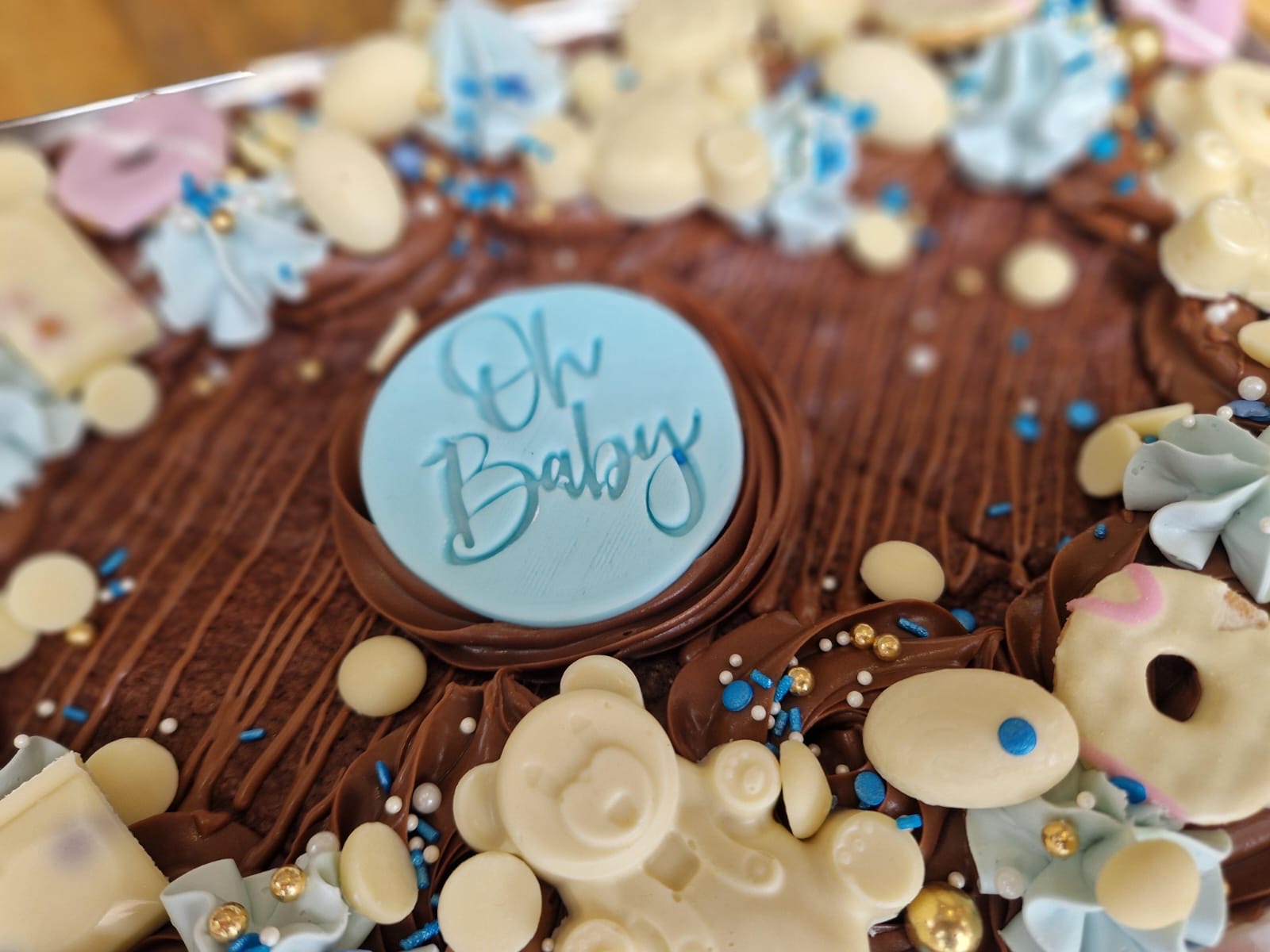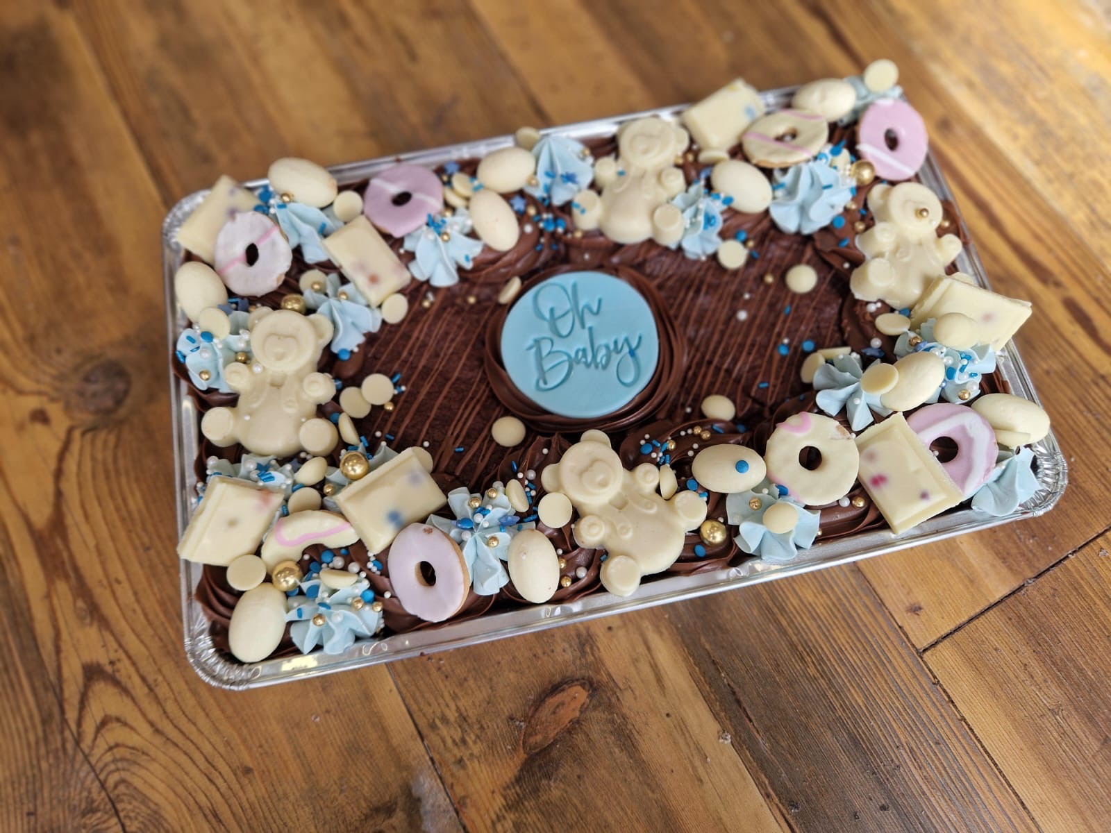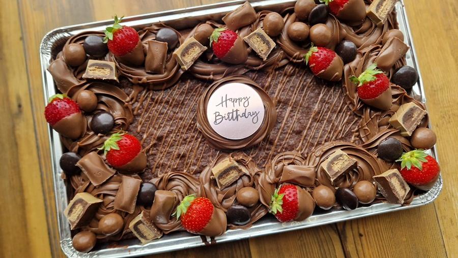 Each slab features a moist chocolate brownie base, topped with luscious chocolate frosting and generously decorated with a range of choices: